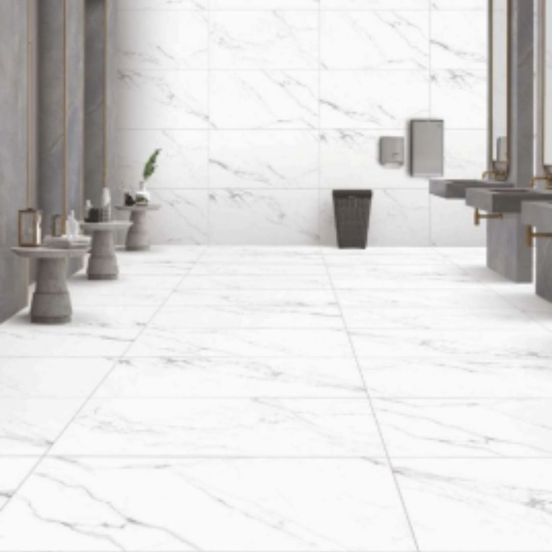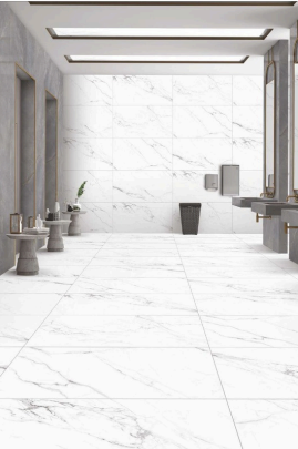 A luxurious marble-look tile in pristine white, laced with elegant grey veining. This timeless design brings classic opulence to modern settings, ideal for elevating any space with grace.